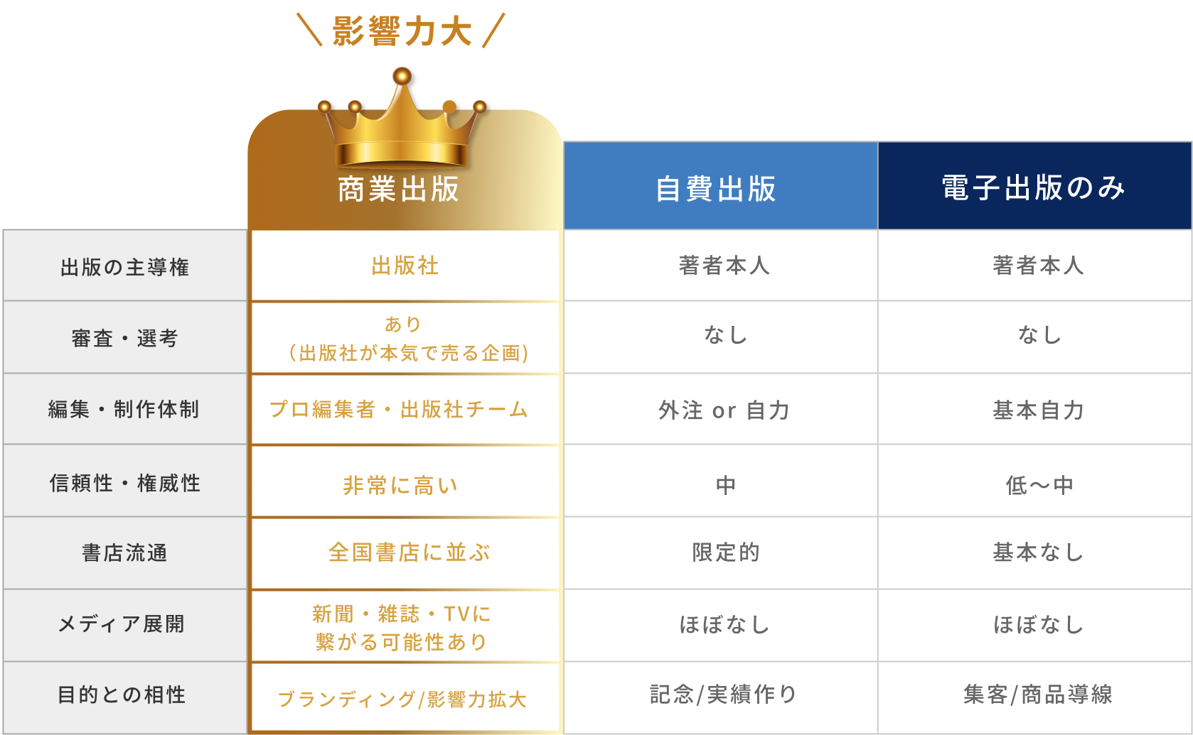 出版方法の比較(商業出版・自費出版・電子出版のみ)